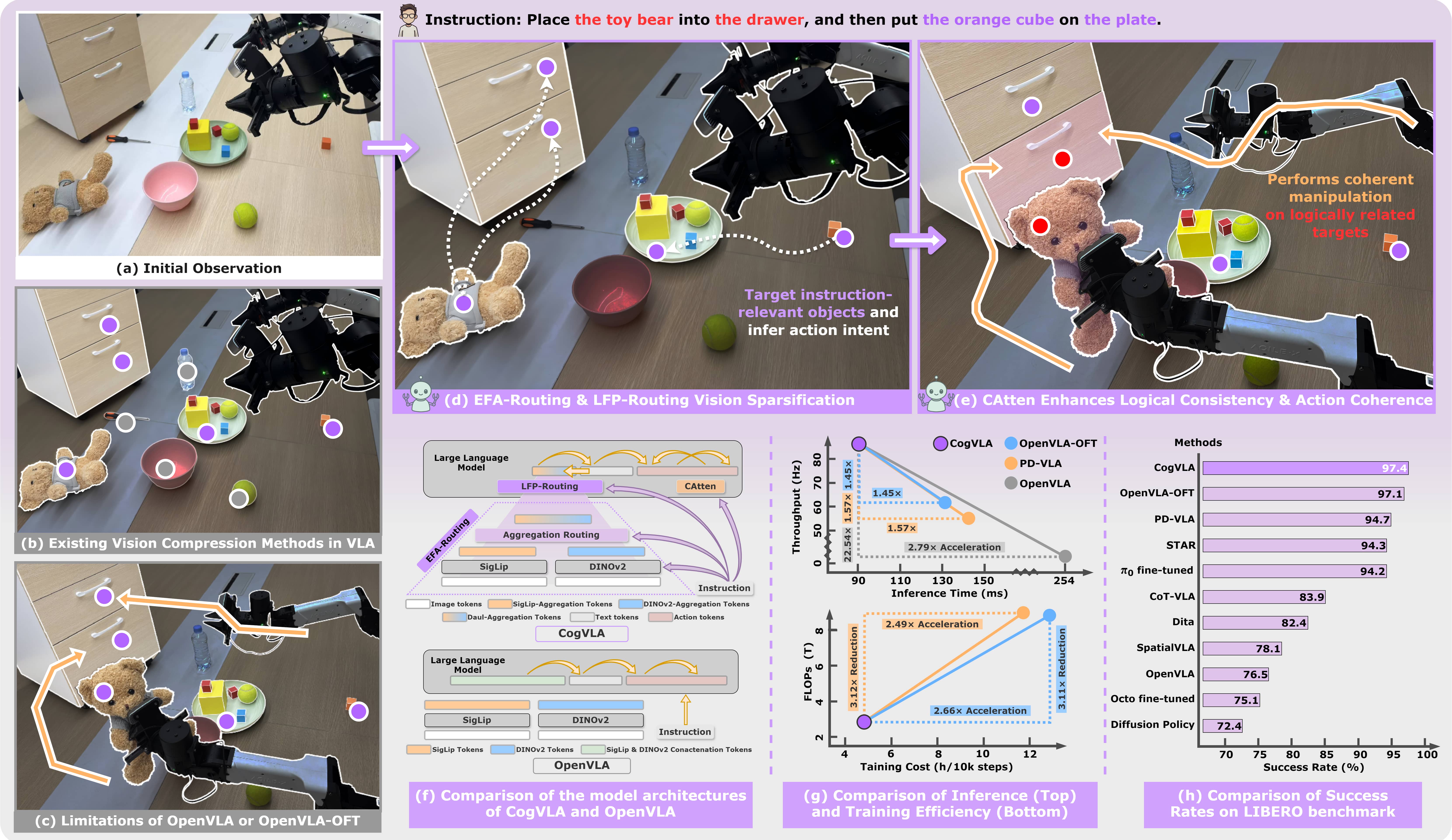 We presented CogVLA, a cognition-aligned and instruction-driven Vision-Language-Action framework designed